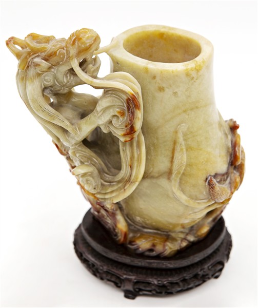 Vaso in pietra saponaria con decoro floreale a rilievo, ai lati un drago ed un