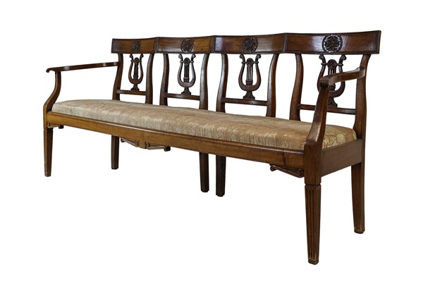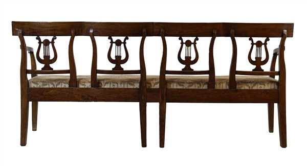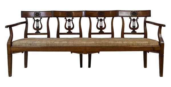 Divano in noce a quattro posti, schienale a giorno con cartelle intagliate e traforate a lira, gambe scanalate. Inizio secolo XIX (cm 180x78x40) (difetti)