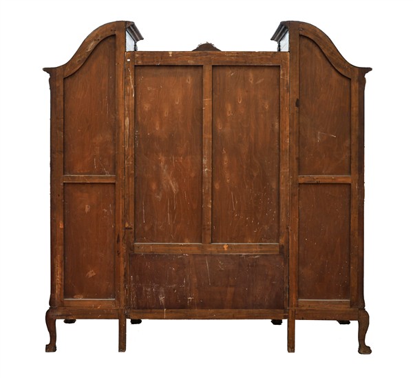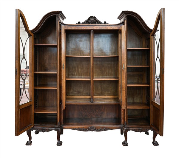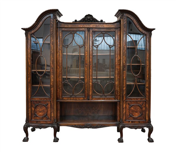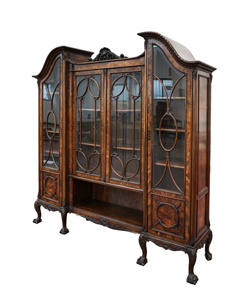 Libreria di forma architettonica in mogano impiallacciata in radica con quattro ante a vetri ed un vano a giorno, cimasa a timpano spezzato con decoro a volute, gambe mosse terminanti ad artiglio su sfera. Inghilterra, secolo XIX-XX (cm 206x209x49) (difetti)