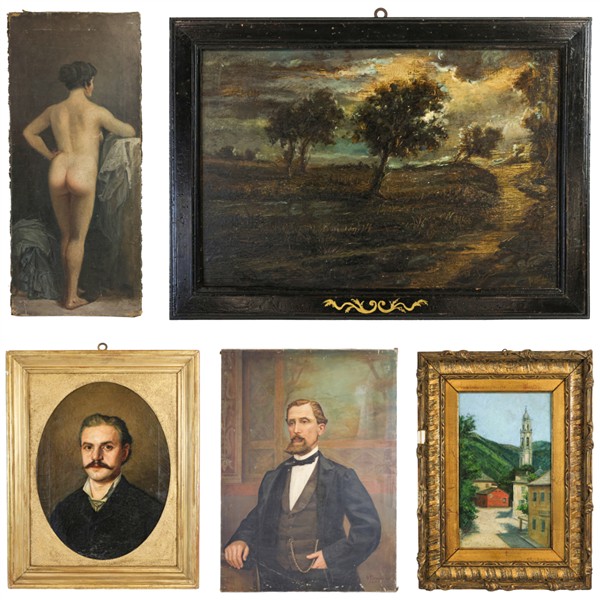 Lotto composta da cinque dipinti ad olio di diversi autori tra cui Giuseppe Sidoli, di diversi soggetti, supporti e formati