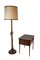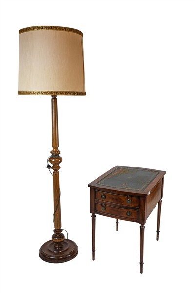 Lotto composto da un comodino a due cassetti con gambe scanalate e piano con inserto in pelle impressa in oro (cm 64x64x46) e una lampada da terra con fusto in legno tornito e paralume in stoffa (h cm 171) (difetti)