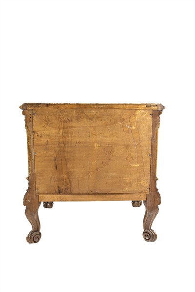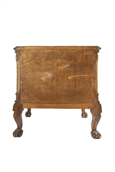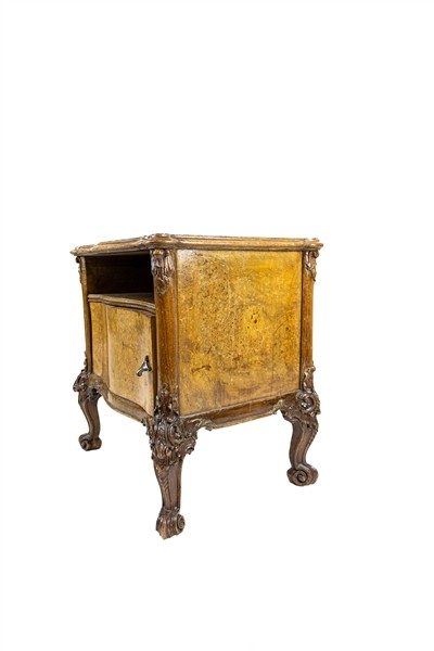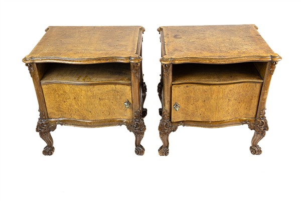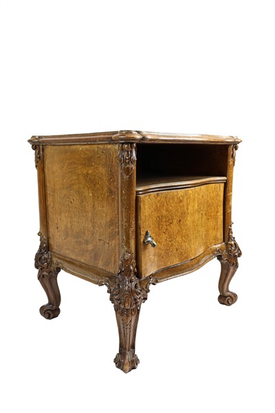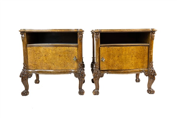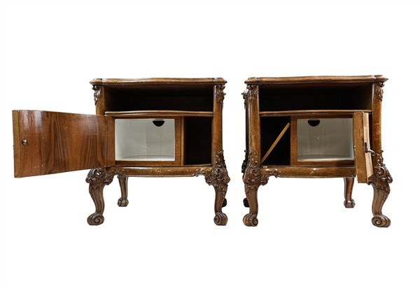 Coppia di comodini in stile Chippendale in legno intagliato e impiallacciato in