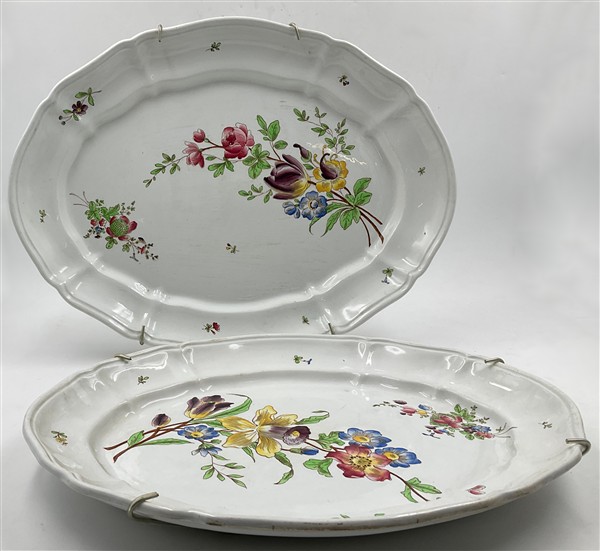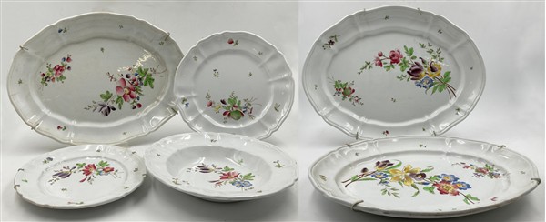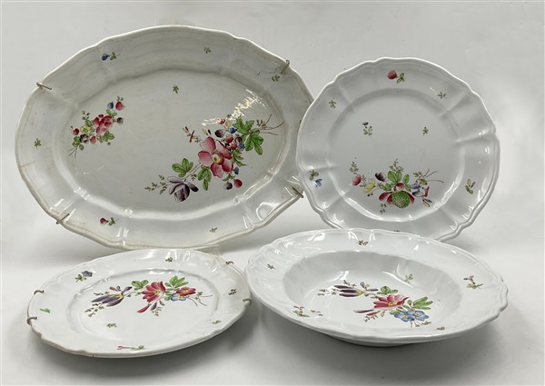 Manifattura Società Ceramiche Richard. Parte di servizio di piatti in ceramica a bordo mistilineo con decoro floreale, composto da quattordici piatti piani e otto fondi, sedici piatti da frutta e quattro piatti da portata di differenti capienze. Marca SCR incussa (difetti)