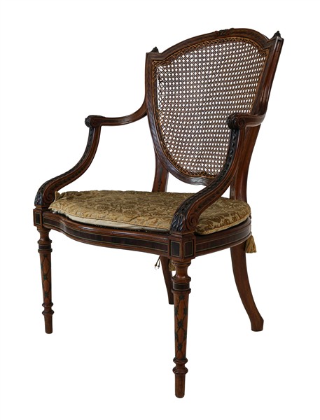 Poltrona in mogano intagliato e dipinto con seduta e schienale a scudo in pagli