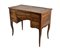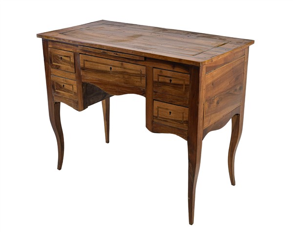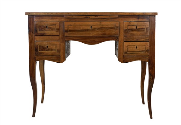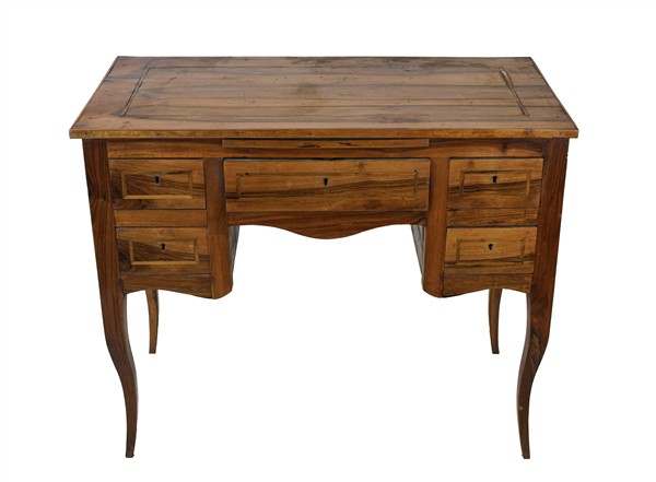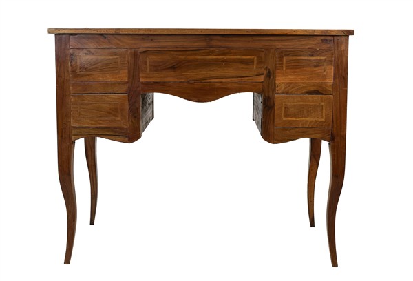 Scrittoio da centro lastronato e filettato in legni vari, fronte a cinque diversi cassetti, gambe mosse (cm 101x82x52) (difetti)