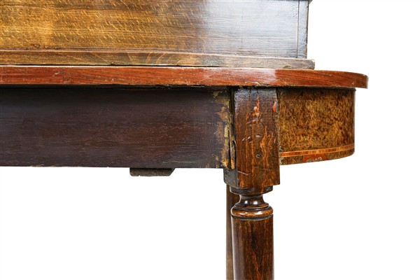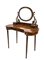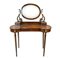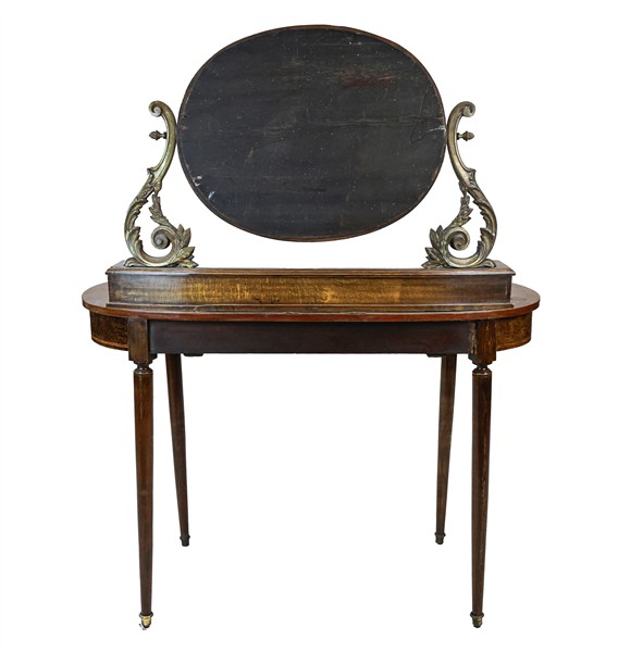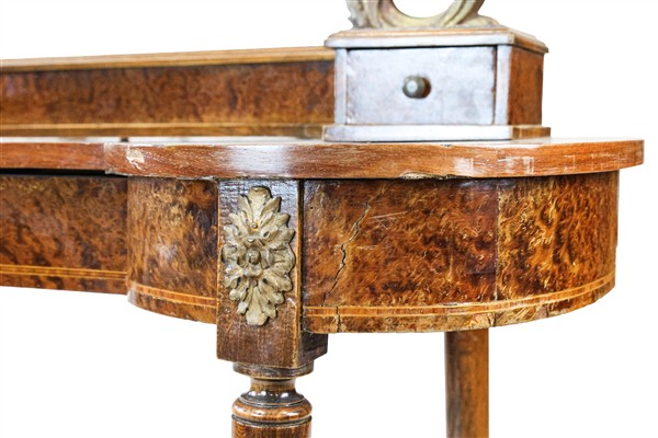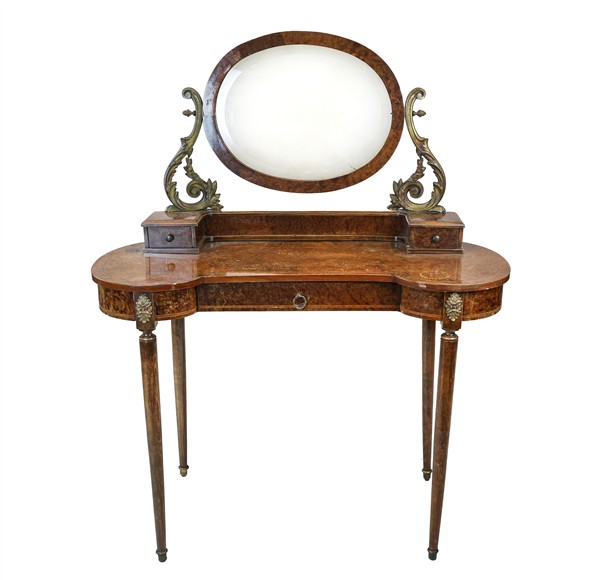 Toilette impiallacciata in radica con piano sagomato e cassetto nella fascia, gambe tornite, parte superiore con specchio ovale basculante con sostegni in bronzo a volute su doppio cassettino. (cm 107x133x44) (difetti e mancanze)