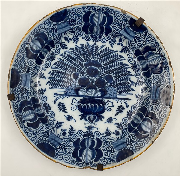 Manifattura di Delft, secolo XVIII. Piatto in maiolica dipinta in monocromia blu con decoro "a penna di pavone" (d. cm 35) (difetti e piccole mancanze)