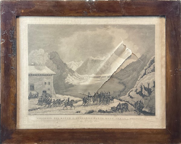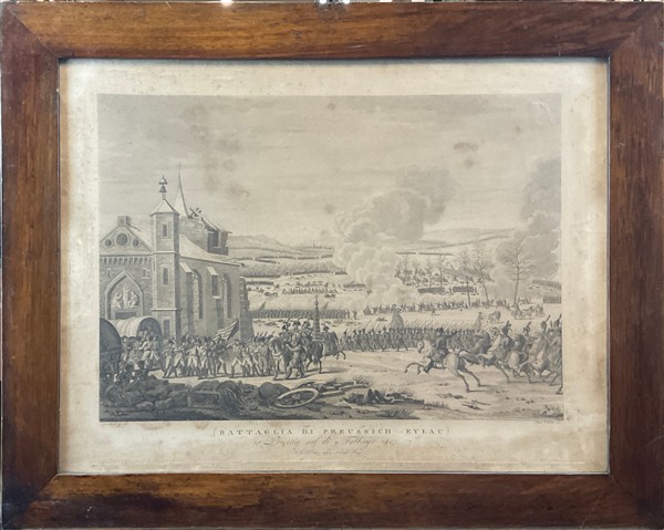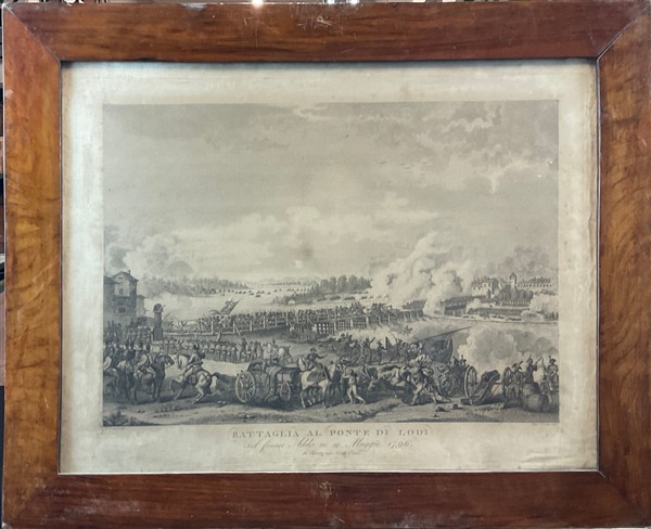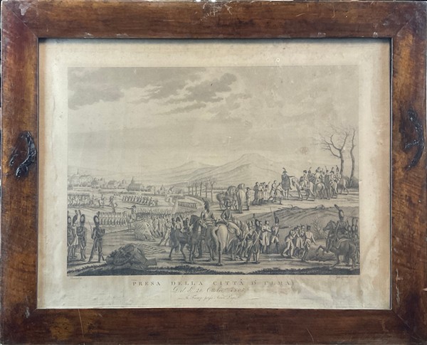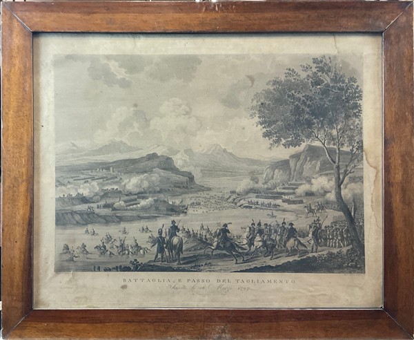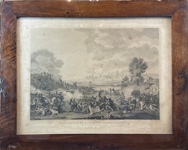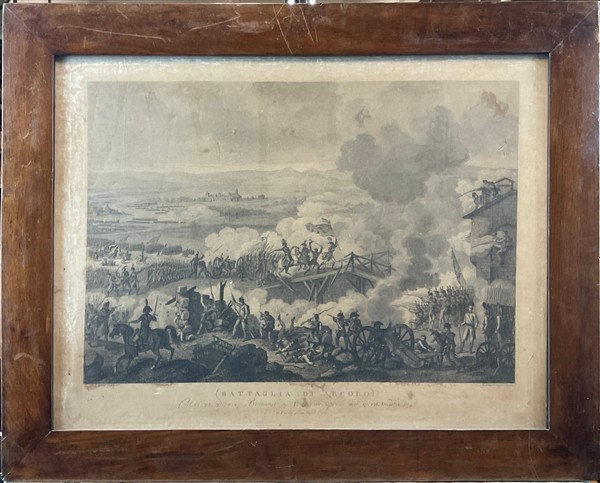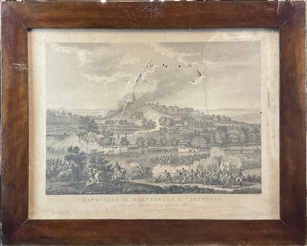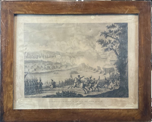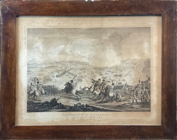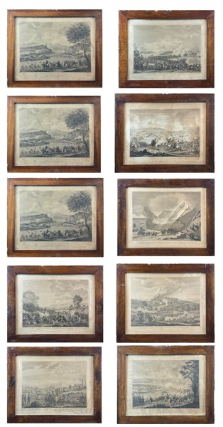 Lotto di dieci incisioni del secolo XIX incollate su tela raffiguranti scene di battaglie napoleoniche (fogli cm 38x50), in cornici (difetti e strappi)