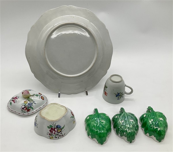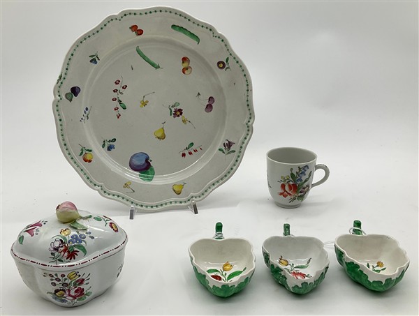 Manifattura di Ginori, Doccia, secolo XVIII-XIX. Lotto composto da tre coppette da sorbetto a foglia, una zuccheriera con coperchio quadrilobata, una tazza ed un piatto a profilo polilobato in porcellana dipinta in policromia ''al mazzetto'' e fiori e frutta (d max 27) (difetti e restauri)