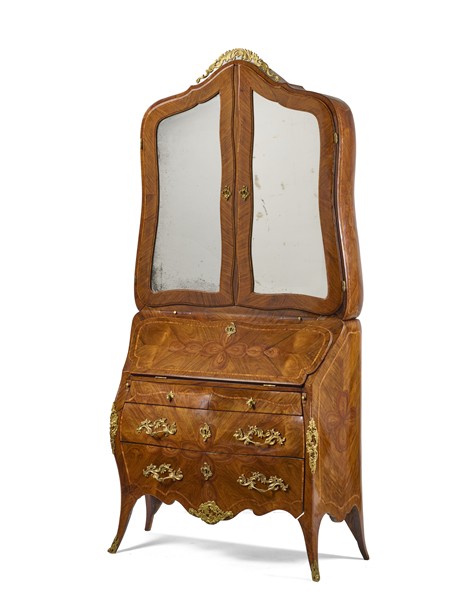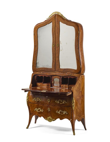 Trumeau di forma mossa e bombata lastronato in palissandro, filettato in bois de rose e bois de violette e interamente intarsiato a quadrifoglio. Parte superiore con due ante a specchio, interno con tiretti e scomparti. La calatoia sotto due piani estraibili rivela vani a giorno, quattro cassettini ed anta centrale con specchio. Sul fronte due cassetti sotto altri due più piccoli allineati. Guarnizioni in bronzo. Genova, secolo XVIII (cm 105x244x51) (restauri e sostituzioni)