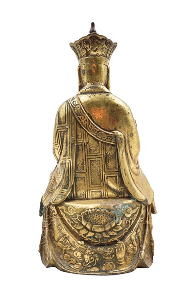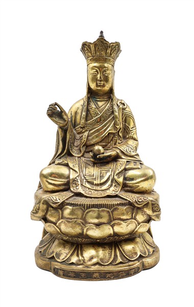 Figura di Lama assiso su grande su fiore di loto in metallo dorato Cina, secol