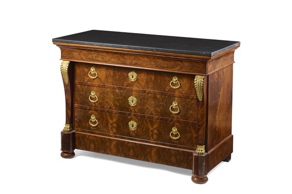 Cassettone lastronato in piuma di mogano con fronte a tre cassetti sotto uno a mezza altezza e uno dissimulato alla base, lesene sagomate terminanti a zampa ferina. Guarnizioni in bronzo dorato. Piano in marmo nero. Secolo XIX (cm 130x93x59) (difetti, sbeccature al marmo)