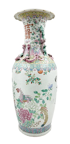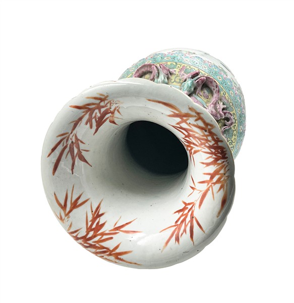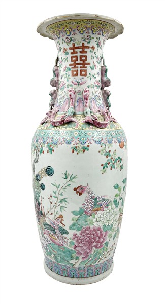 Vaso in porcellana policroma Famiglia Rosa decorato con motivi floreali ed anse con cani di Pho, la spalla del vaso con draghi a rilievo.
