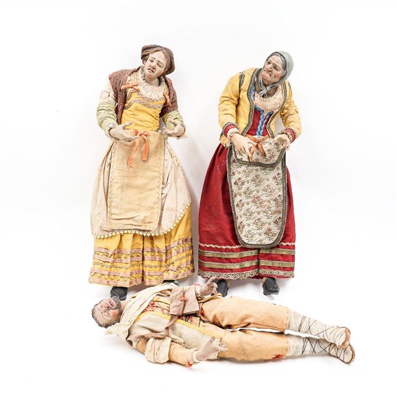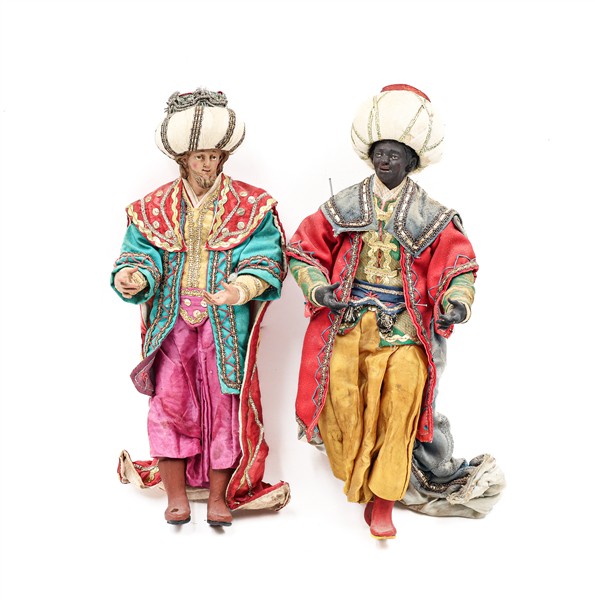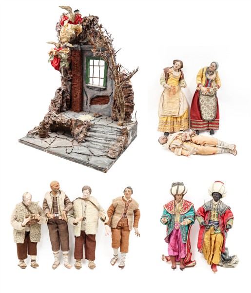 Arte napoletana, secolo XX. Lotto composto da una struttura da presepe in legno e sughero dipinti e diverse figure in terracotta policroma ed altri materiali con abiti in lana, seta e tessuti di varie fogge: due figure di Re Magi, due angeli, quattro pastori, un benino e due popolane, alcuni con basi in legno (h max figure cm 38, struttura cm 52x80) (difetti, rotture e restauri)