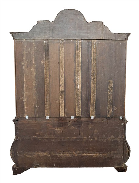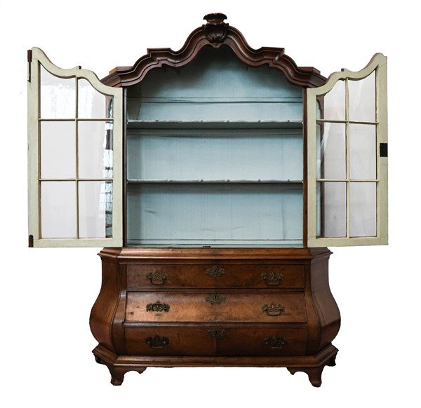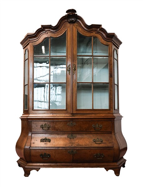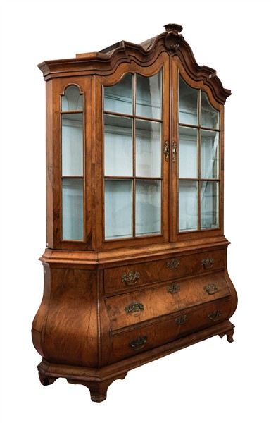 Mobile vetrina a due corpi in noce ed altri legni, parte inferiore a tre cassetti su fronte mossa, parte superiore a due sportelli sagomati. Olanda, secolo XIX-XX (cm 169x230x40) (difetti, restauri e mancante delle chiavi)