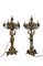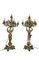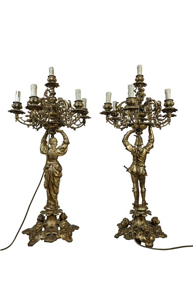 Coppia di candelabri a sette luci in metallo dorato con fusto a figure reggenti