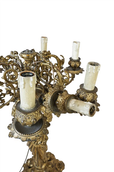 Coppia di candelabri a sette luci in metallo dorato con fusto a figure reggenti bracci a volute, basi sagomate con teste d'angelo e foglie. Fine secolo XIX. Elettrificati in epoca successiva (h cm 92) (difetti e rotture)