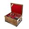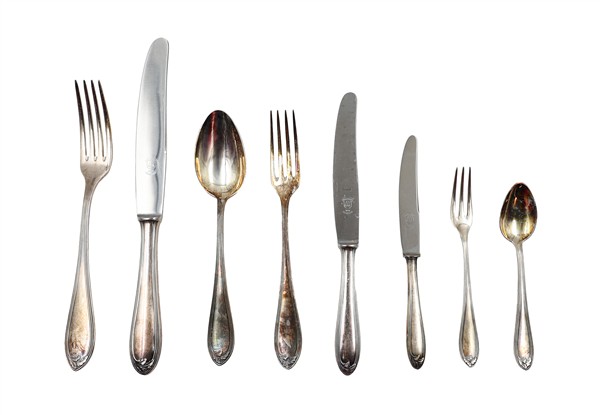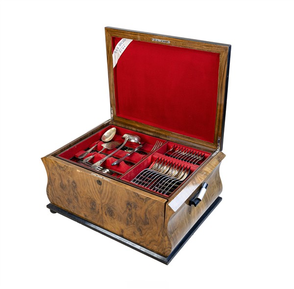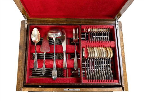Servizio di posate in alpacca composto da ventiquattro forchette, ventiquattro coltelli, dodici cucchiai, dodici forchette e dodici cucchiai più piccoli, dodici coltelli e forchette da frutta, dodici cucchiaini da tè, dodici cucchiaini da caffè e cinque posate a servire. Entro cofanetto originale impiallacciato in radica. Inizio secolo XX (cm 61x32x45) (difetti).