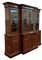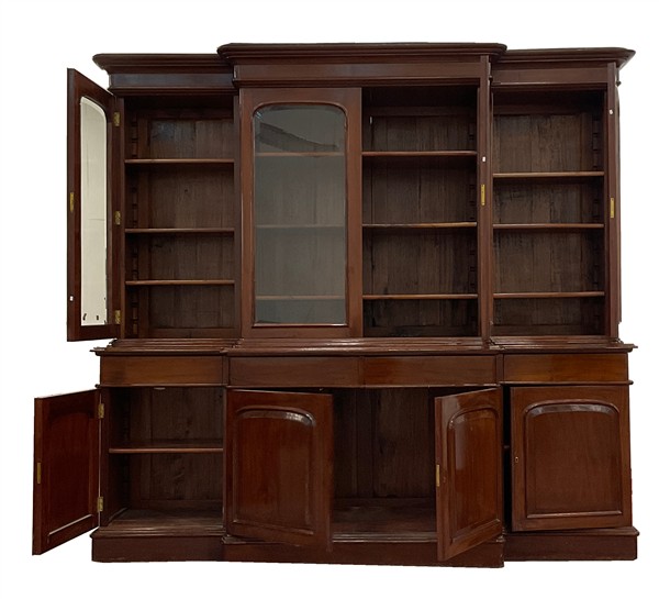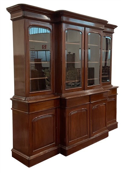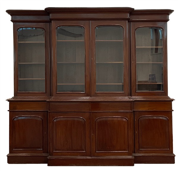 Libreria in mogano a due corpi, parte inferiore a quattro sportelli pannellati e quattro cassetti, parte superiore a quattro ante con vetro e ripiani interni, cappello modanato aggettante. Inghilterra, inizio secolo XX (cm 244x227x60) (difetti e chiavi mancanti)