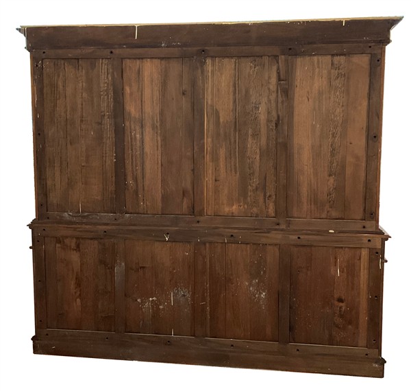 Libreria in mogano a due corpi, parte inferiore a quattro sportelli pannellati