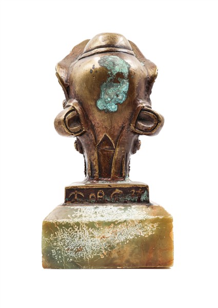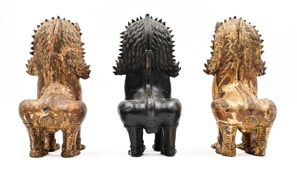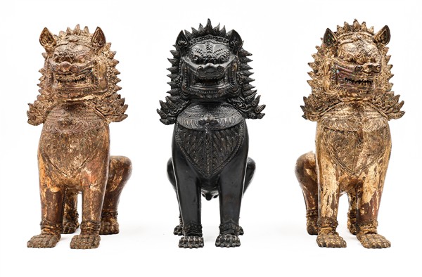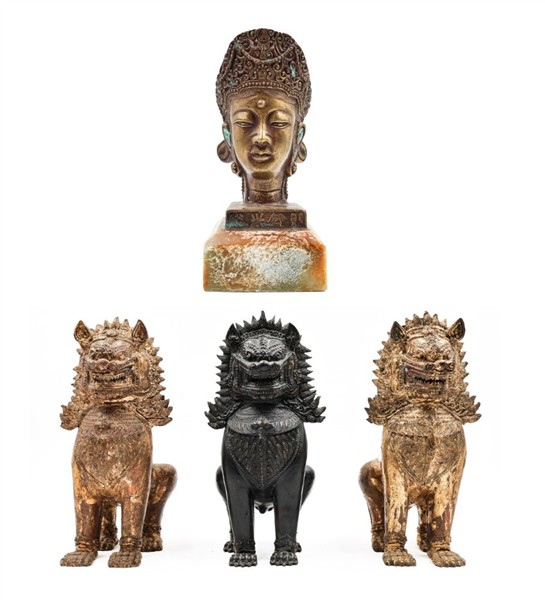 Lotto composto da tre leoni buddisti ed una testa di divinità femminile in bron