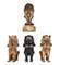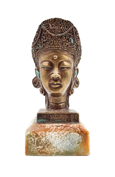 Lotto composto da tre leoni buddisti ed una testa di divinità femminile in bronzo ed altri materiali