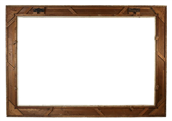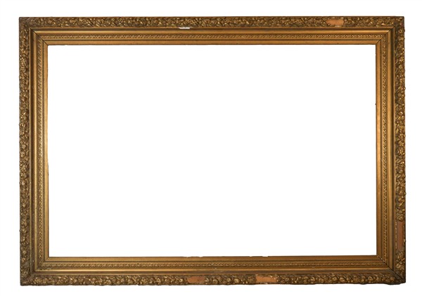 Grande cornice in legno e stucco dorato a triplo ordine con fascia decorata a frutti e bordura perlinata. Inizio secolo XX (cm 162x233, battuta cm 131x201) (difetti e mancanze)