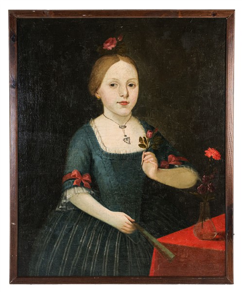Antico dipinto raffigurante "Fanciulla con fiore e ventaglio"