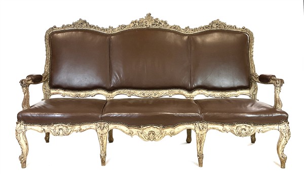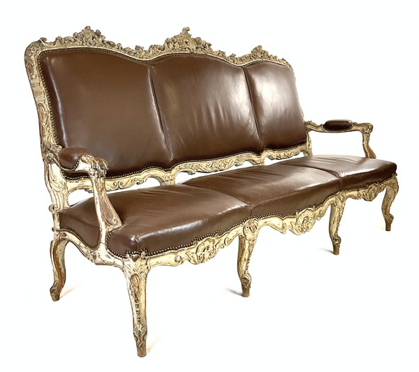 Divano a tre posti in legno riccamente intagliato a volute e motivi roccaille e floreali, gambe e braccioli mossi desinenti a ricciolo, tracce di laccatura e doratura. Secolo XVIII. Rivestimento in pelle marrone di epoca posteriore (cm 204x122x65) (difetti e restauri)