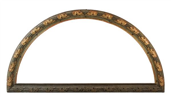 Cornice centinata in legno e stucco dipinto e dorato con decori a foglie d'acanto e scanalature. Secolo XIX (cm 200x106, battuta cm 178x84) (difetti)