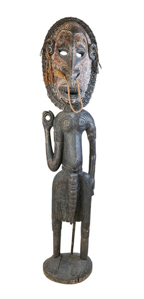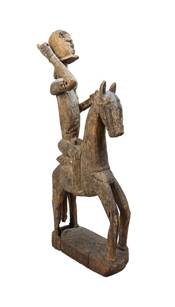 Arte africana. Lotto composto da una scultura in legno parzialmente dipinto e fibre vegetali raffigurante un guerriero (h cm 150) ed una scultura in legno con figura maschile a cavallo (h cm 80) (difetti e mancanze)