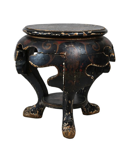 Tavolino in legno laccato a tre piedi decorato a motivi orientali in policromia su fondo nero. Inizio secolo XX (d cm 34, h cm 36) (difetti)