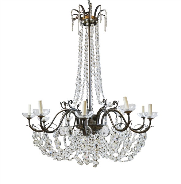 *Lampadario in metallo a dieci bracci e quattordici luci con bobeche e pendenti