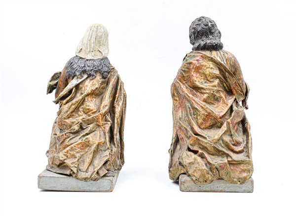 Arte dell'Italia meridionale, secolo XIX. Presepe in papier-machè e legno policromo con profili dorati composto da figure di Maria, Giuseppe e il Bambino, occhi in pasta vitrea (h. max cm 29) (difetti e mancanze)