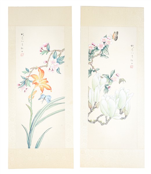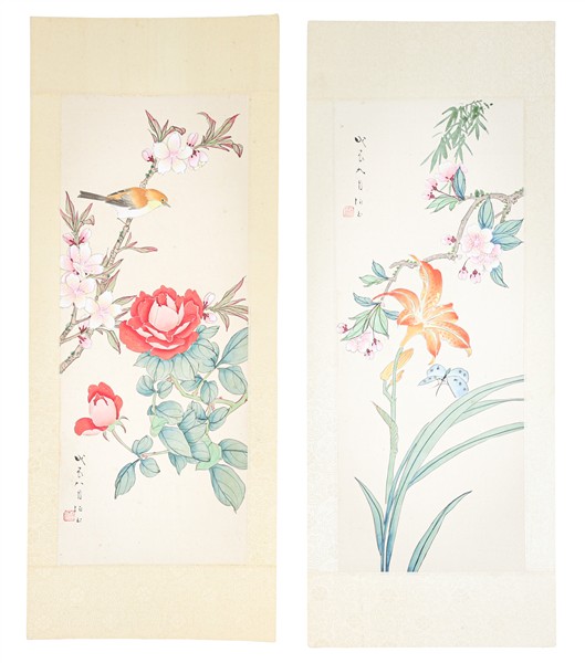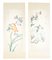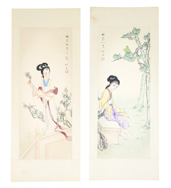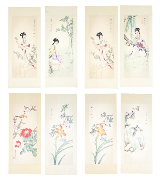 Lotto composto da quarantaquattro stampe su seta raffiguranti figure femminili in dei giardini e motivi floreali