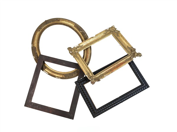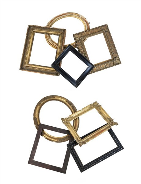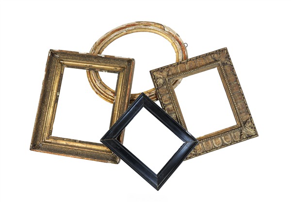 Due cartoni contenenti numerose cornici in legno di varie misure ed epoche, alcune dorate (difetti e rotture)