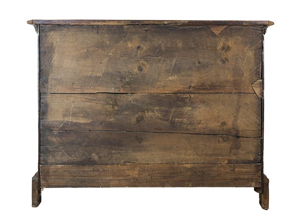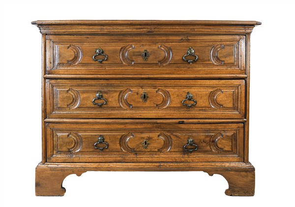 Cassettone in noce con fronte a tre cassetti decorati da scanalature, piedi a mensola. Secolo XVIII (cm 128x102x60) (difetti e sostituzioni)