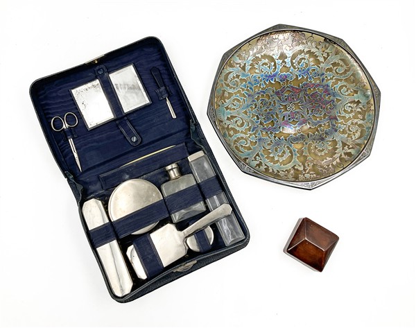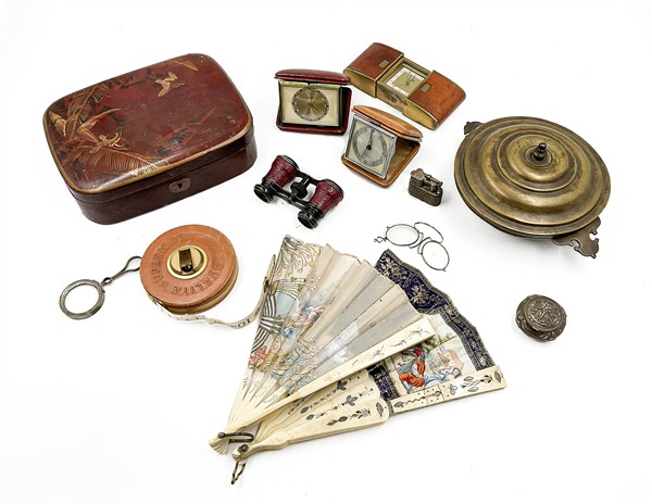 Cartone contenente numerosi oggetti di epoche e forme diverse tra cui alcuni ventagli, una scatola in lacca, binocolo (difetti)