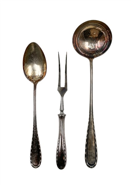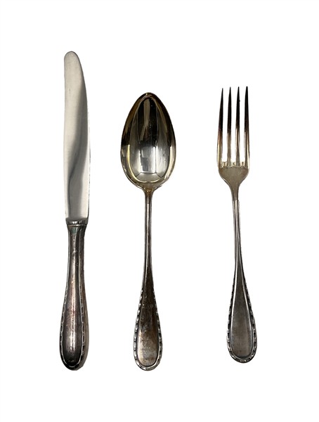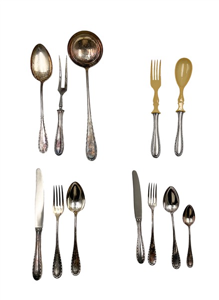 Servizio di posate in metallo argentato composto da dodici forchette, dodici coltelli, dodici cucchiai, dodici forchette, coltelli e cucchiai più piccoli, dodici cucchiaini da tè e sei posate a servire. Inizio secolo XX. Entro scatola (difetti)