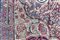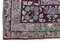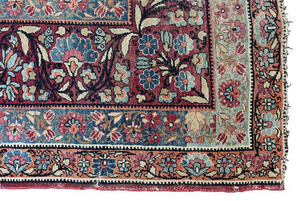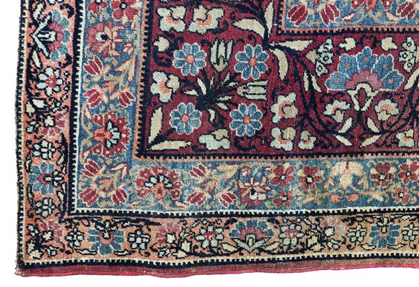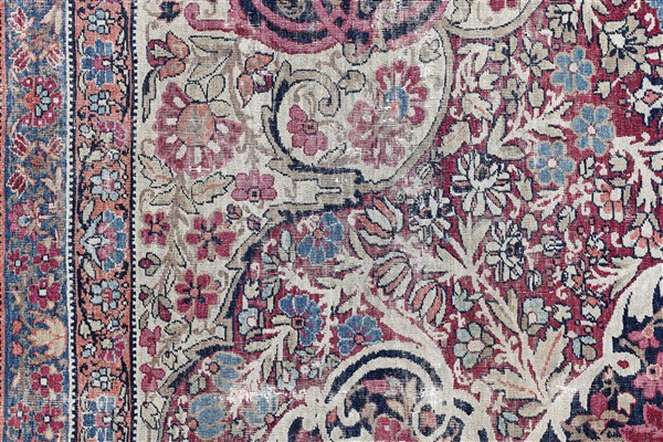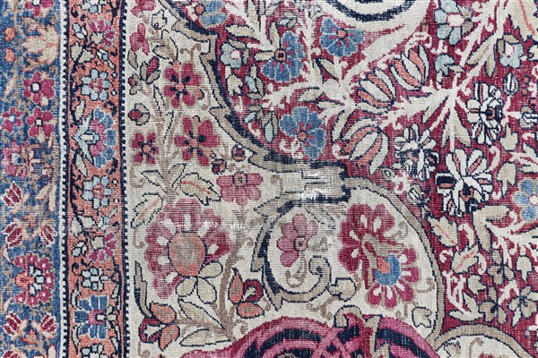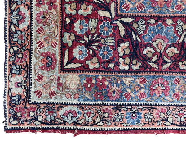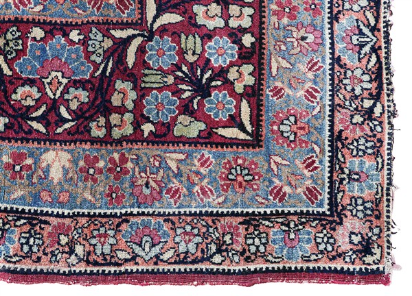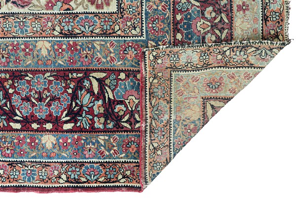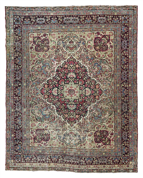 Tappeto Kirman Laver, Persia, fine secolo XIX. Decoro con grande medaglione floreale con puntali a fondo blu notte su campo color ciclamino cosparso di rami fioriti. Bordura principale a meandro con fiori azzurri su fondo ciclamino (cm 304x239) (difetti, rapature e vecchi restauri)