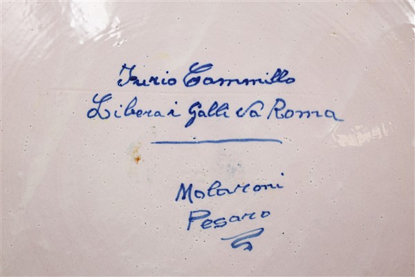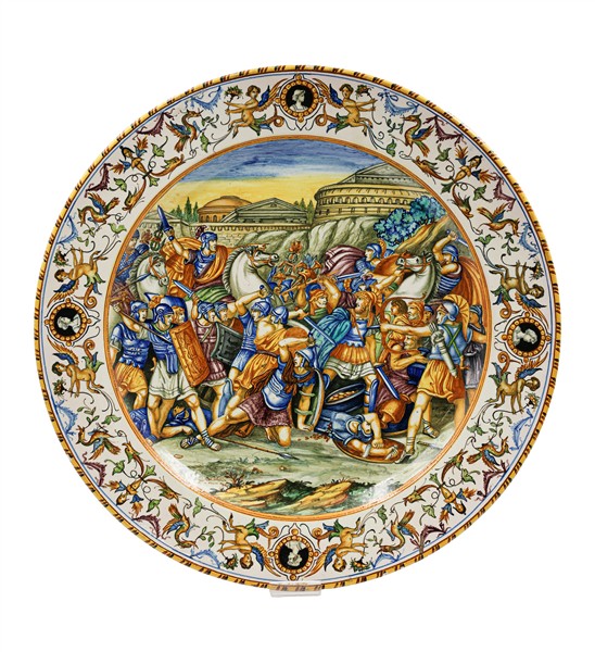 Manifattura Molaroni, Pesaro, fine secolo XIX. Piatto istoriato in ceramica policroma raffigurante "Furio Camillo libera i Galli da Roma", firmato e titolato al verso (d cm 51) (difetti)