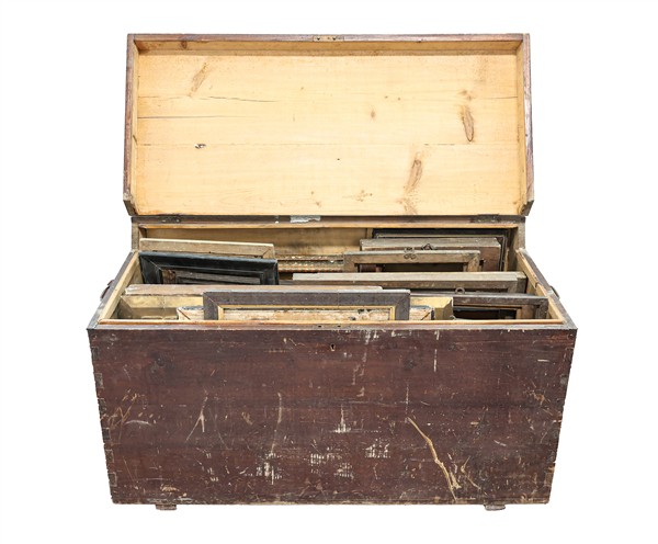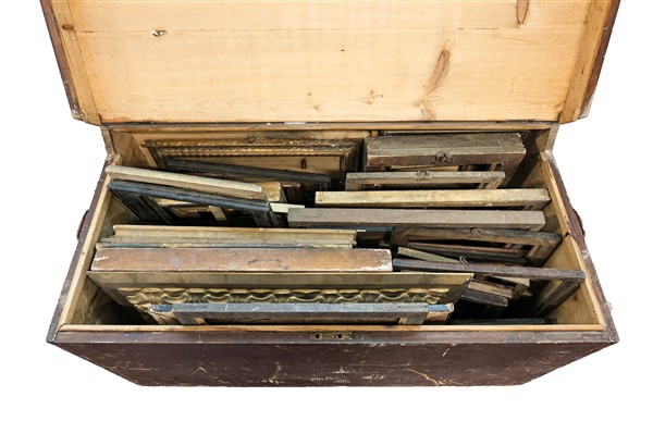 Baule contenente numerose cornici in legno di varie misure ed epoche, alcune do
