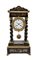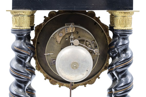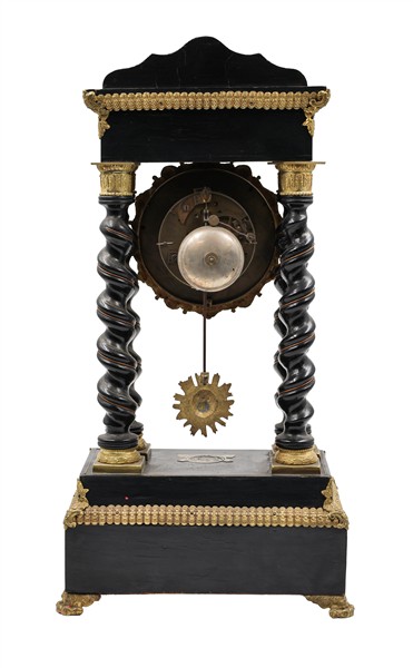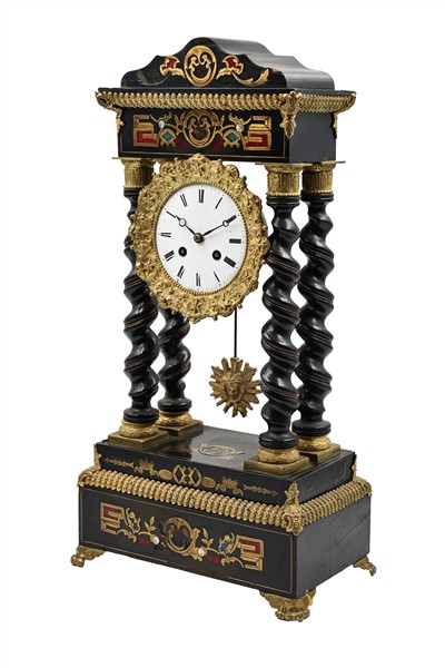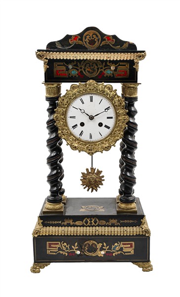 Orologio a portico in legno ebanizzato con inserti in bronzo dorato, madreperla e finta tartaruga. Quadrante in smalto bianco a numeri romani. Suoneria delle ore e mezze su campanello. Francia, metà secolo XIX (h. cm 50) (difetti e piccole mancanze)