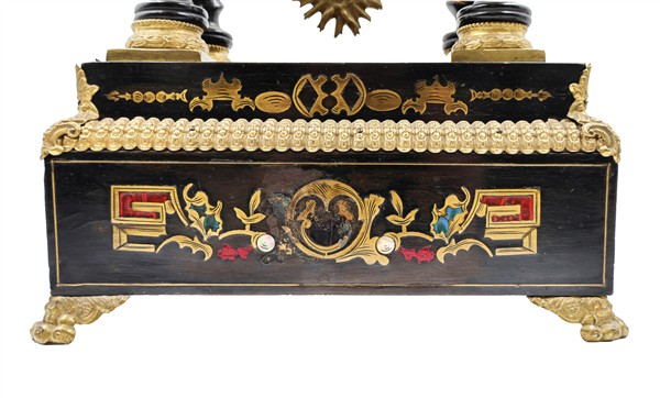 Orologio a portico in legno ebanizzato con inserti in bronzo dorato, madreperla