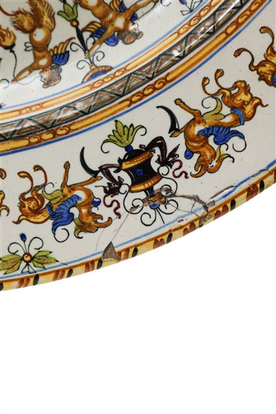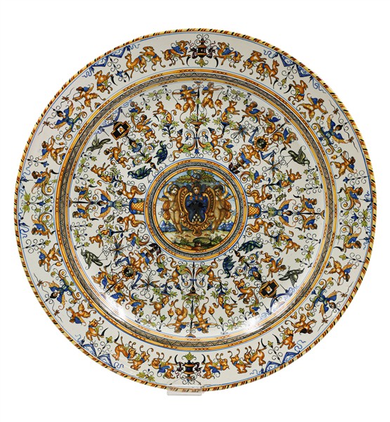 Manifattura Molaroni, Pesaro, fine secolo XIX. Piatto in ceramica decorato in policromia a grottesche centrato da stemma araldico della famiglia Veterani di Urbino retto da angeli entro riserva, firmato al verso (d cm 51) (difetti)