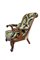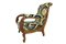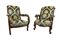 Due diverse poltrone in legni vari decorate da intagli con schienale e seduta rivestiti in velluto e fili di metallo argentato (difetti)