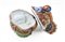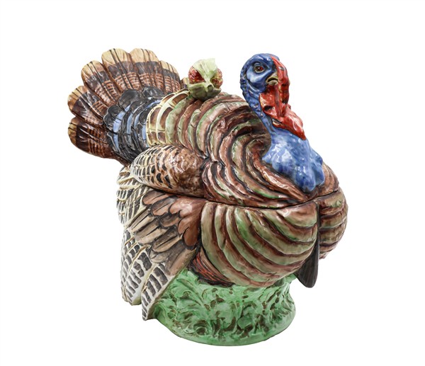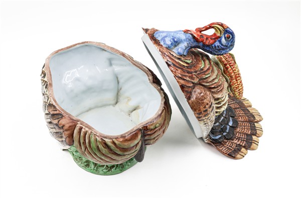 Contenitore con coperchio a forma di tacchino in porcellana policroma con presa