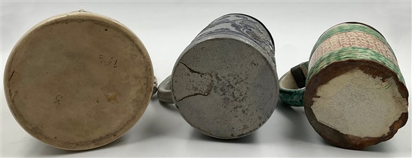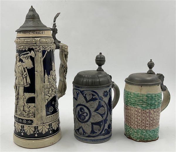 Lotto composto da tre boccali in ceramica policroma, coperchi in metallo e peltro, decori diversi (h max cm 33) (difetti)