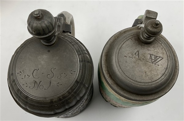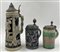 Lotto composto da tre boccali in ceramica policroma, coperchi in metallo e pelt