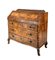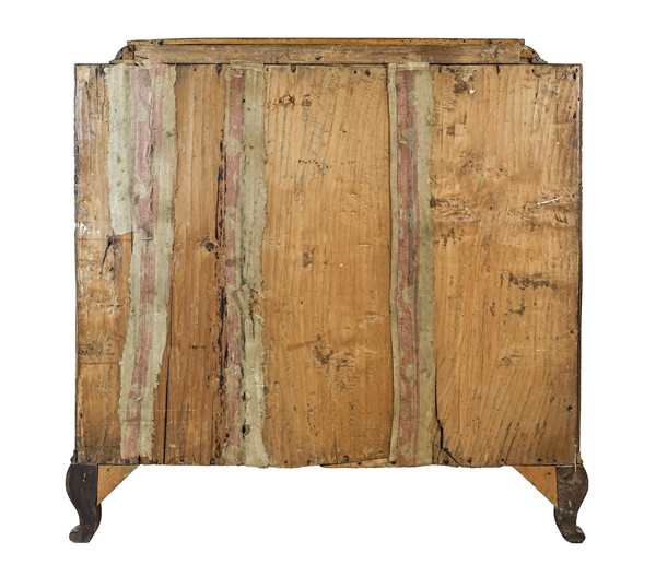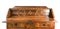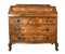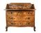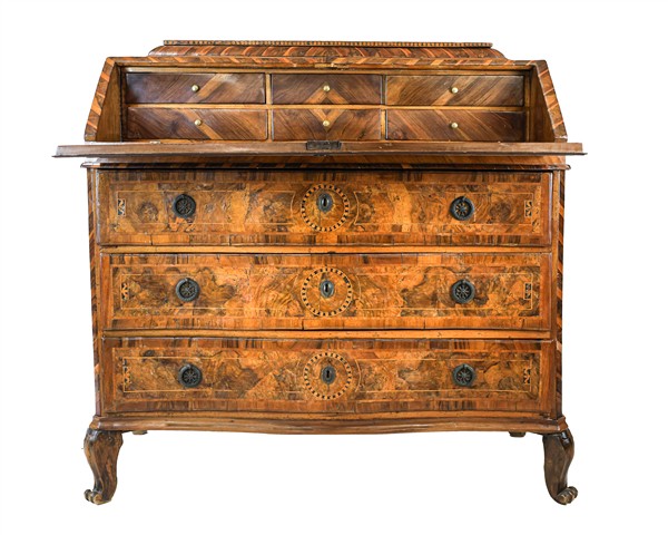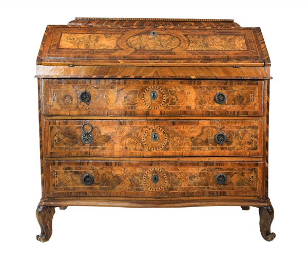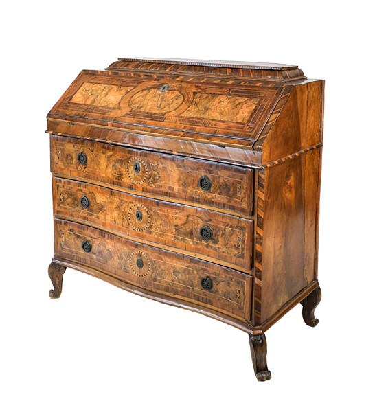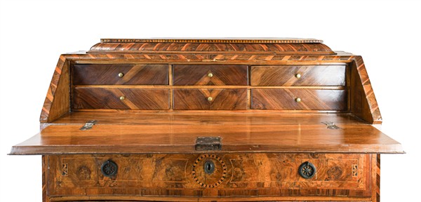 Ribalta lastronata in noce e filettata in legni di varia essenza con specchiature radicate, fronte mosso a tre cassetti e calatoia celante sei tiretti, pianetto superiore ribaltabile. Fine secolo XVIII (cm 128x117,5x55) (difetti e restauri)
